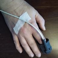 Place sensor over your finger, making sure that your finger goes to the end of the sensor and TAPE the wire to your hand.